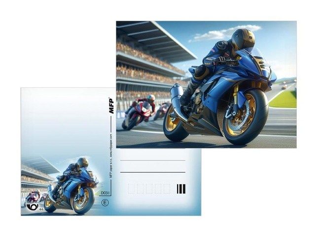 Pohlednice s motivy různých závodních prostředí (motorky, letadlo, formule…). Pohlednice jsou bez textu na zadní straně. Text: 0/6 Povrchová úprava: UV lak Papír: pohlednicový karton 240 g Uvedená cena je za 1 ks.