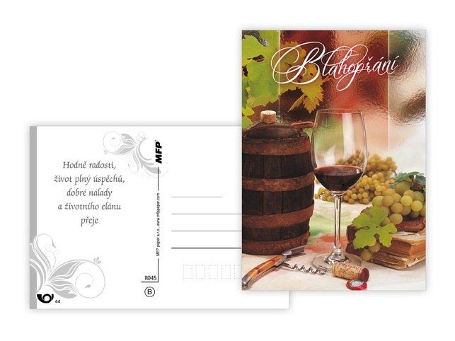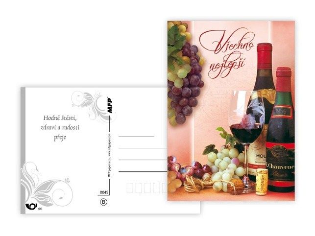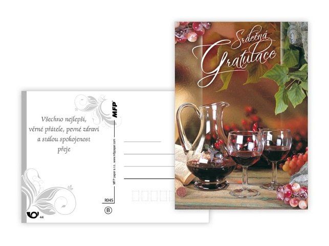 Srdečné pohlednice s textem. Text obsahují 4 pohledy z 6. Text na přední straně: Srdečná gratulace, Všechno nejlepší, Blahopřání, Hodně štěstí, Gratulace Text na zadní straně: Pohlednice 1: Všechno nejlepší, věrné přátelé, pevné zdraví a stálou spokojenost přeje Pohlednice 2: Všechno nejlepší, hodně zdraví, štěstí, lásky a spokojenosti přeje Pohlednice 3: Hodně radosti, život plný úspěchů, dobré nálady a životního elánu přeje Pohlednice 4: Hodně štěstí, zdraví a radosti přeje Pohlednice 5,6 bez textu Papír: pohlednicový karton 240 g Povrchová úprava: UV lak Text: 4/6 Uvedená cena je za 1 ks.