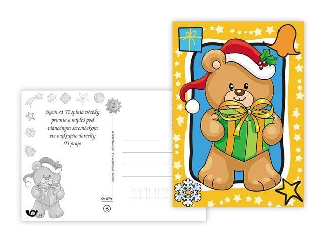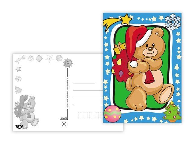 Dětské Vánoční pohlednice s velkým obrázkem. Set 6 motivů. Velkoobchodní balení je po 100ks. Pohlednice jsou bez textu na zadní straně. Papír: pohlednicový karton 300 g Povrchová úprava: UV lak Text: 0/6 Uvedená cena je za 1 ks.