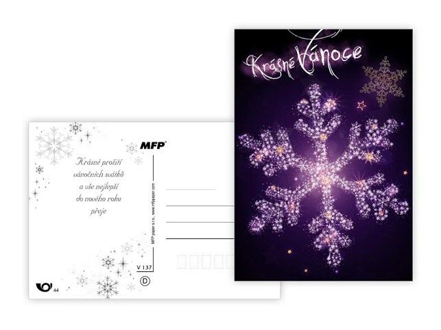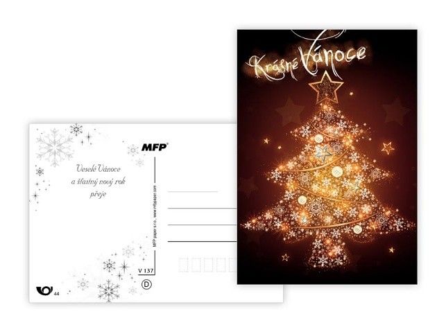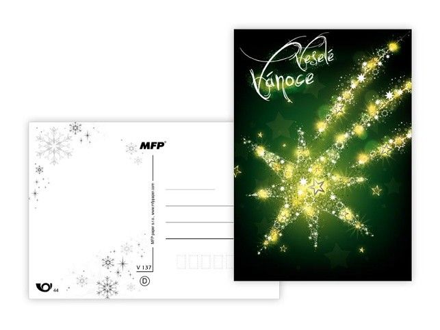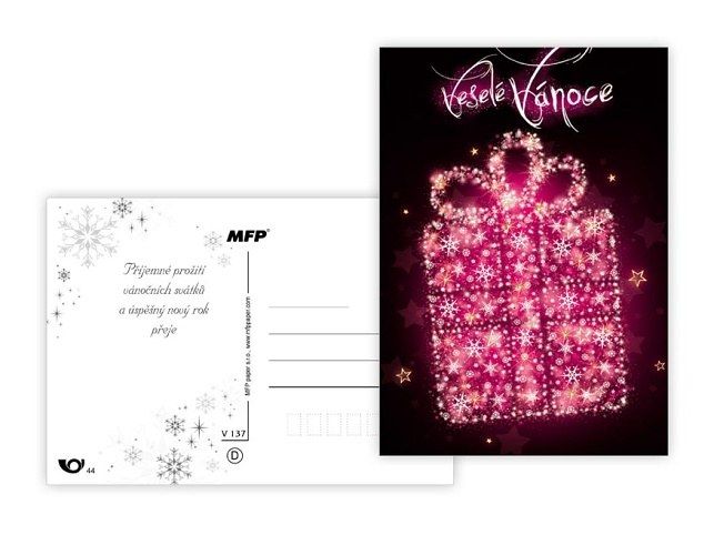 Pohlednice s vánočním motivem. Text obsahují 4 pohlednice z 6. Text na přední straně: Krásné Vánoce, Veselé Vánoce Text na zadní straně: Pohlednice 1: Veselé Vánoce a Šťastný nový rok přeje Pohlednice 2: Příjemné prožití vánočních svátků a úspěšný nový rok přeje Pohlednice 3: Veselé Vánoce a Šťastný nový rok přeje Pohlednice 4, 5, 6 bez textu Papír: pohlednicový karton 240 g Povrchová úprava: sametové lamino Text: 4/6 Uvedená cena je za 1 ks.