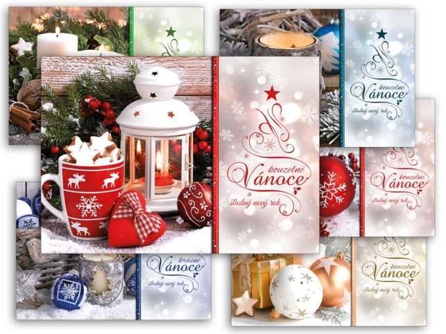 Pohlednice s vánočním motivem. Text obsahují 3 pohlednice z 6. Text na přední straně: Kouzelné Vánoce a šťastný nový rok Text na zadní straně: Pohlednice 1: Veselé Vánoce a Šťastný nový rok přeje Pohlednice 2: Příjemné prožití vánočních svátků a úspěšný nový rok přeje Pohlednice 3: Veselé Vánoce a Šťastný nový rok přeje Pohlednice 4, 5, 6 bez textu Papír: pohlednicový karton 240 g Povrchová úprava: bez povrchové úpravy Text: 3/6 Uvedená cena je za 1 ks.