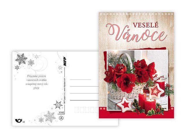 Pohlednice s vánočním motivem. Text na zadní straně obsahují 4 pohlednice z 6. Papír: pohlednicový karton 240 g Povrchová úprava: ofsetový lak Text: 4/6 Uvedená cena je za 1 ks.