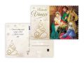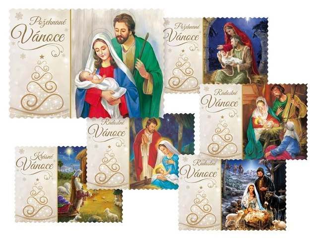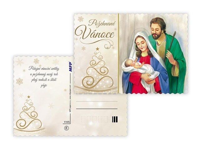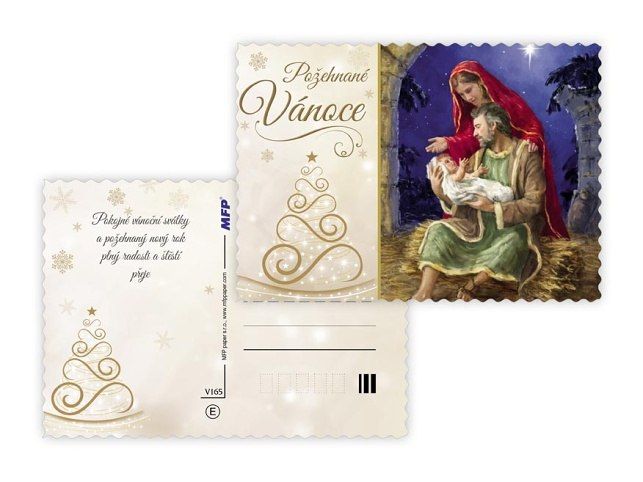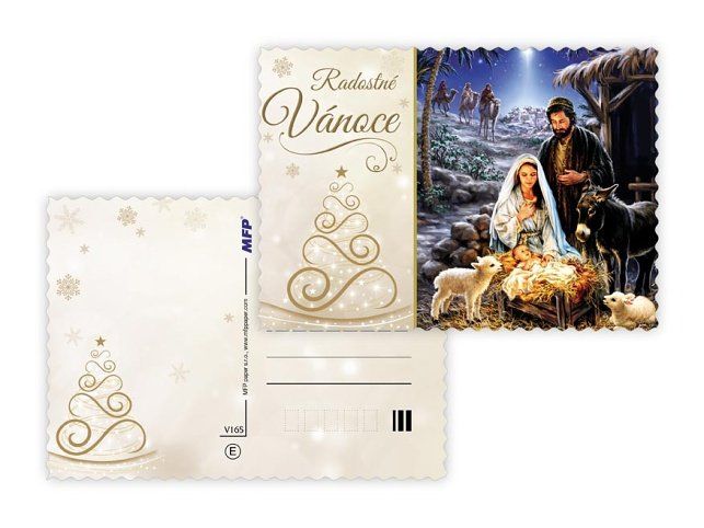 Pohlednice s vánočním motivem. Text na zadní straně obsahují 4 pohlednice z 6. Text na přední straně: Požehnané Vánoce, Radostné Vánoce, Krásné Vánoce Text na zadní straně: Pohlednice 1: Pokojné vánoční svátky a požehnaný nový rok plný radosti a štěstí přeje Pohlednice 2: Vánoční svátky prožité v pokoji a radosti z Ježíšova narození přeje Pohlednice 3: Pokojné vánoční svátky a požehnaný nový rok plný radosti a štěstí přeje Pohlednice 4: Aby do celého domu pronikla pokojná vánoční atmosféra a vydržela po celý rok přeje Papír: pohlednicový karton 240 g Povrchová úprava: UV lak, výsek, glitr Text: 4/6 Uvedená cena je za 1 ks.