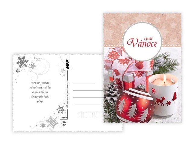 Pohlednice s vánočním motivem. Text na zadní straně obsahují 4 pohlednice z 6. Text na přední straně: Kouzelné Vánoce, Veselé Vánoce, Krásné Vánoce, Veselé Vánoce a šťastný nový rok, Krásné Vánoce a bohatou nadílku Text na zadní straně: Pohlednice 1: Veselé Vánoce a šťastný nový rok přeje Pohlednice 2: Krásné prožití vánočních svátků a vše nejlepší do nového roku přeje Pohlednice 3: Příjemné prožití vánočních svátků a úspěšný nový rok přeje Pohlednice 4: Veselé Vánoce a šťastný nový rok přeje Papír: pohlednicový karton 240 g Povrchová úprava: výsek Text: 4/6 Uvedená cena je za 1 ks.