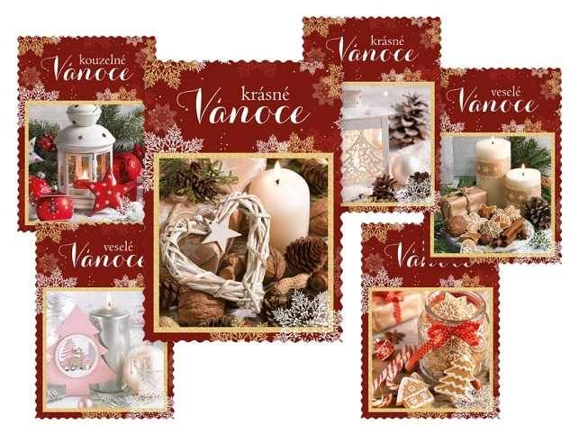 Pohlednice s vánočním motivem. Text na zadní straně obsahují 4 pohlednice z 6. Text na přední straně: Kouzelné Vánoce, Veselé Vánoce, Krásné Vánoce, Text na zadní straně: Pohlednice 1: Pokojné vánoční svátky a požehnaný nový rok plný radosti a štěstí přeje Pohlednice 2: Vánoční svátky prožité v pokoji a radosti z Ježíšova narození přeje Pohlednice 3: Příjemné prožití vánočních svátků a úspěšný nový rok přeje Pohlednice 4: Krásné prožití vánočních svátků a vše nejlepší do nového roku přeje Pohlednice 5, 6 bez textu Papír: pohlednicový karton 240 g Povrchová úprava: výsek Text: 4/6 Uvedená cena je za 1 ks.