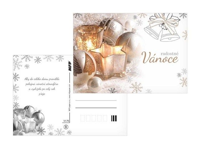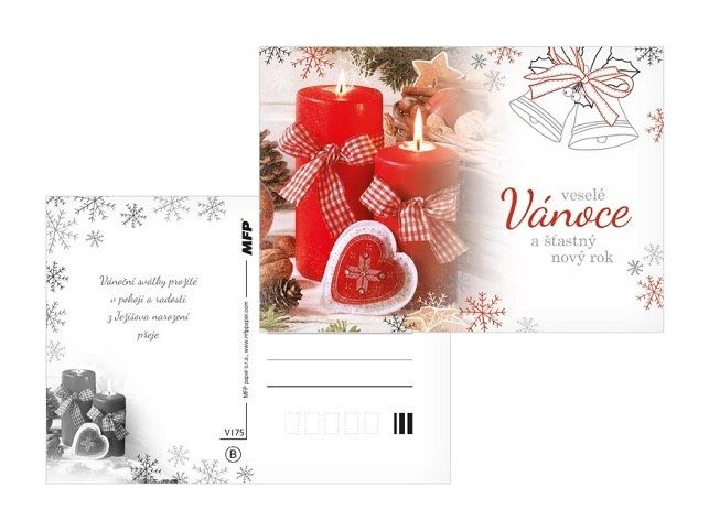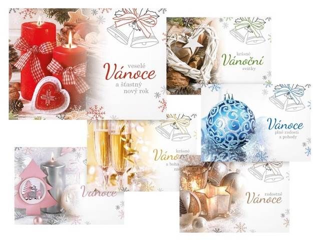 Pohlednice s vánočním motivem. Text na zadní straně obsahují 6 pohlednice z 6. Text na přední straně: Radostné Vánoce, Vánoce plné radosti a pohody, Krásné Vánoce a bohatou nadílku, Veselé Vánoce a šťastný nový rok, Krásné Vánoční svátky, Kouzelné Vánoce Text na zadní straně: Pohlednice 1: Veselé Vánoce a šťastný nový rok přeje Pohlednice 2: Krásné prožití vánočních svátků a vše nejlepší do nového roku přeje Pohlednice 3: Příjemné prožití vánočních svátků a úspěšný nový rok přeje Pohlednice 4: Pokojné vánoční svátky a požehnaný nový rok plný radosti a štěstí přeje Pohlednice 5: Vánoční svátky prožité v pokoji a radosti z Ježíšova narození přeje Pohlednice 6: Aby do celého domu pronikla pokojná vánoční atmosféra a vydržela po celý rok přeje Papír: pohlednicový karton 240 g Povrchová úprava: bez úpravy Text: 6/6 Uvedená cena je za 1 ks.