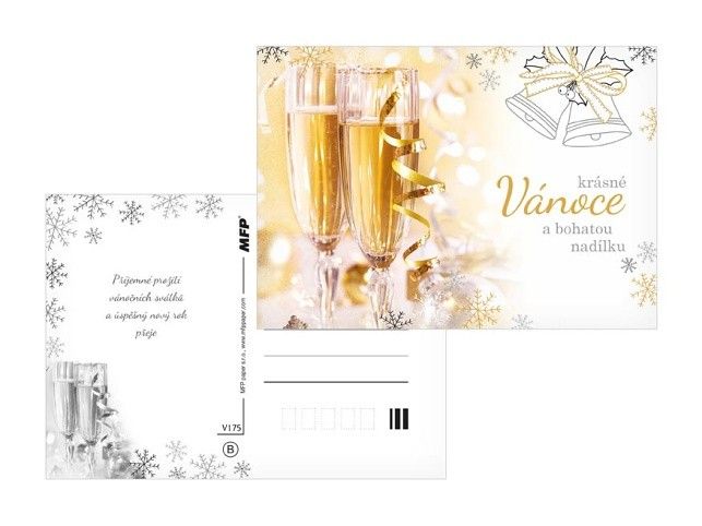 Pohlednice s vánočním motivem. Text na zadní straně obsahují 6 pohlednice z 6. Text na přední straně: Radostné Vánoce, Vánoce plné radosti a pohody, Krásné Vánoce a bohatou nadílku, Veselé Vánoce a šťastný nový rok, Krásné Vánoční svátky, Kouzelné Vánoce Text na zadní straně: Pohlednice 1: Veselé Vánoce a šťastný nový rok přeje Pohlednice 2: Krásné prožití vánočních svátků a vše nejlepší do nového roku přeje Pohlednice 3: Příjemné prožití vánočních svátků a úspěšný nový rok přeje Pohlednice 4: Pokojné vánoční svátky a požehnaný nový rok plný radosti a štěstí přeje Pohlednice 5: Vánoční svátky prožité v pokoji a radosti z Ježíšova narození přeje Pohlednice 6: Aby do celého domu pronikla pokojná vánoční atmosféra a vydržela po celý rok přeje Papír: pohlednicový karton 240 g Povrchová úprava: bez úpravy Text: 6/6 Uvedená cena je za 1 ks.