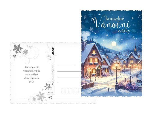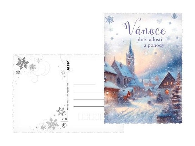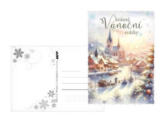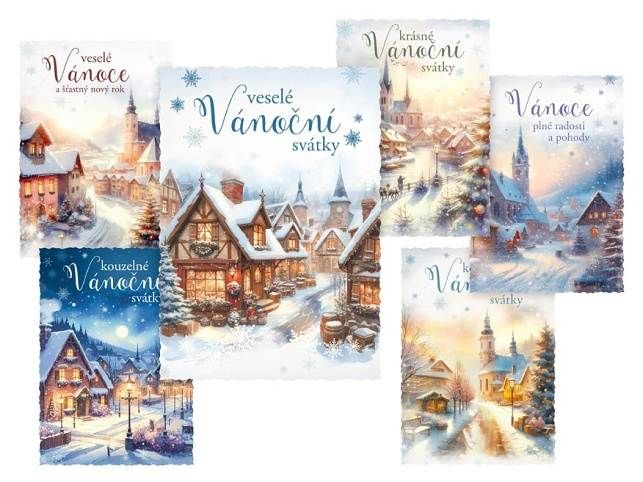 Pohlednice s vánočním motivem. Vánoční pohlednice jsou nejen praktickým způsobem, jak popřát Veselé Vánoce, ale také krásným a tradičním prvkem, který přináší radost a spojuje lidi během svátečního období. Vyberte si u nás z široké nabídky pohlednic s vánočními motivy, které potěší vaše blízké a zpříjemní vánoční čas. Naše pohlednice jsou ideální pro sdílení sváteční atmosféry, přání k Vánocům a vytváření krásných vzpomínek. Text na zadní straně obsahují 3 pohlednice z 6. Text na přední straně: Veselé Vánioce a šťastný nový rok, Kouzelné vánoční svátky, Veselé vánoční svátky, Krásné vánoční svátky, Vánoce plné radosti a pohody, Krásné vánoční svátky Text na zadní straně: Pohlednice 1: Příjemné prožití vánočních svátků a úspěšný nový rok přeje Pohlednice 2: Krásné prožití vánočních svátků a vše nejlepší do nového roku přeje Pohlednice 3: Veselé Vánoce a šťastný nový rok přeje Pohlednice 4 - 6 bez textu Text: 3/6 Povrchová úprava: výsek Papír: pohlednicový karton 240 g Uvedená cena je za 1 ks.