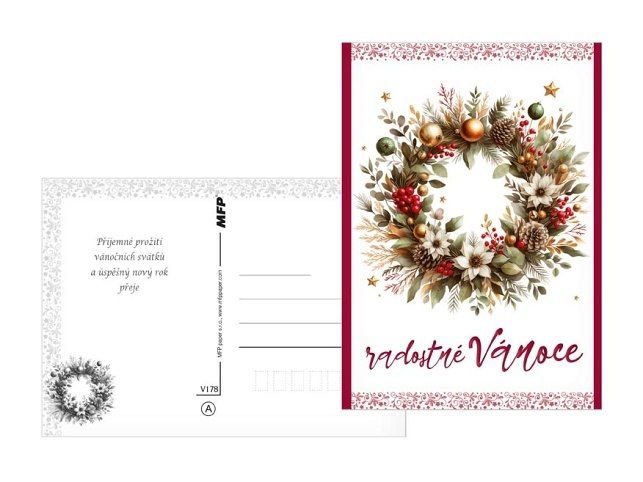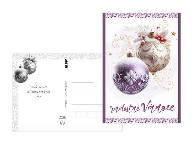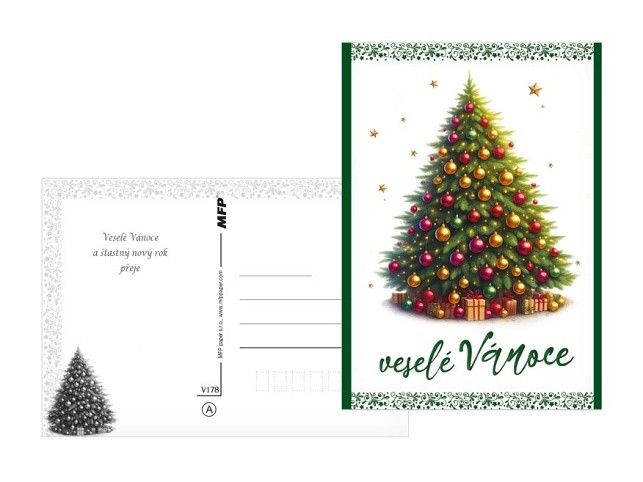 Pohlednice s vánočním motivem. Vánoční pohlednice jsou nejen praktickým způsobem, jak popřát Veselé Vánoce, ale také krásným a tradičním prvkem, který přináší radost a spojuje lidi během svátečního období. Vyberte si u nás z široké nabídky pohlednic s vánočními motivy, které potěší vaše blízké a zpříjemní vánoční čas. Naše pohlednice jsou ideální pro sdílení sváteční atmosféry, přání k Vánocům a vytváření krásných vzpomínek. Text na zadní straně obsahují 3 pohlednice z 6. Text na přední straně: Veselé Vánoce, Radostné Vánoce, Veselé Vánoce, Kouzelné Vánoce, Radostné Vánoce, Kouzelné Vánoce Text na zadní straně: Pohlednice 1: Příjemné prožití vánočních svátků a úspěšný nový rok přeje Pohlednice 2: Veselé Vánoce a šťastný nový rok přeje Pohlednice 3: Veselé Vánoce a šťastný nový rok přeje Pohlednice 4 - 6 bez textu Text: 3/6 Povrchová úprava: bez úpravy Papír: pohlednicový karton 240 g Uvedená cena je za 1 ks.