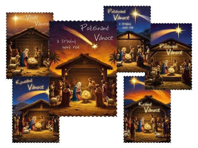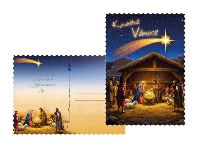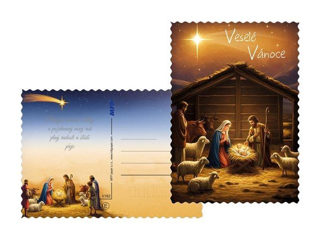 Veselé a Požehnané Vánoce! Pošlete svým blízkým tradiční vánoční pohlednici s krásným motivem Betlémské noci. Na pohlednicích najdete česká vánoční přání jako „Veselé Vánoce“, „Požehnané Vánoce“, „Kouzelné Vánoce“ a další. Ideální pro zaslání srdečného přání, které potěší a vnese do Vánoc radost, klid a kouzlo svátečního času. Text na zadní straně obsahují 3 pohlednice z 6. Text na přední straně: Veselé Vánoce, Kouzelné Vánoce, Požehnané Vánoce a šťastný nový rok, Požehnané Vánoce, Požehnané Vánoce a šťastný nový rok, Krásné Vánoce Text na zadní straně: Pohlednice 1: Vánoční svátky prožité v pokoji a radosti z Ježíšova narození přeje Pohlednice 2: Pokojné vánoční svátky a požehnaný nový rok plný radosti a štěstí přeje Pohlednice 3: Aby do celého domu pronikla pokojná vánoční atmosféra a vydržela po celý rok přeje Pohlednice 4 - 6 bez textu Text: 3/6 Papír: pohlednicový karton 240 g Povrchová úprava: výsek+UV+glitr Uvedená cena je za 1 ks.