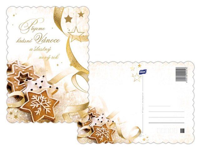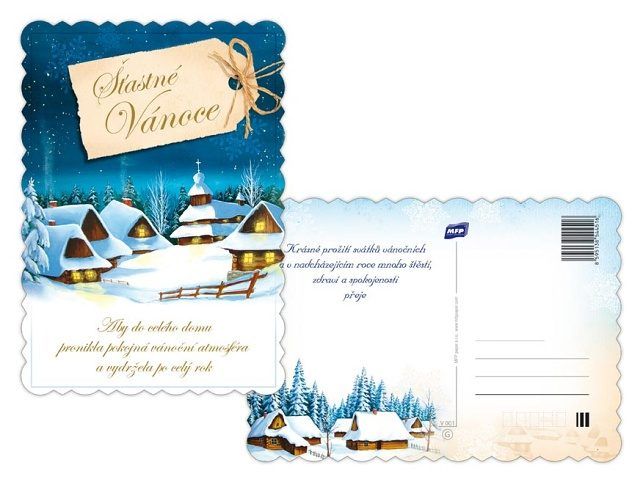 Originální vánoční pohlednice velikosti A5 - Díky této neobyčejné velikosti se Vaše přání bude odlišovat od ostatních. Pohlednice jsou zdobeny výsekem a termoražbou, zadní strana s je vždy s barevným vánočním obrázkem. Text na přední straně: 1. Šťastné Vánoce - Krásné prožití vánočních svátků a vše nejlepší do nového roku 2. Šťastný a veselý vánoční čas 3. Šťastné a veselé Vánoce 4. Krásné Vánoce - Aby do celého domu pronikla krásná vánoční atmosféra a vydržela po celý rok 5. Přejeme krásné Vánoce a šťastný nový rok 6. Kouzelné Vánoce a bohatou nadílku 7. Kouzelné Vánoce 8. Šťastné Vánoce - Aby do celého domu pronikla pokojná vánoční atmosféra a vydržela po celý rok Text na zadní straně: Pohlednice 1: Krásné prožití svátků vánočních a v nadcházejícím roce mnoho štěstí, zdraví a spokojenosti přeje Pohlednice 2: Krásné prožití vánočních svátků a vše nejlepší do nového roku přeje Pohlednice 3: Ať se Ti splní všechna přání a najdeš pod vánočním stromečkem ty nejkrásnější dárky Ti přeje Pohlednice 4: Aby do celého domu pronikla pokojná atmosféra a vydržela po celý rok přeje Pohlednice 5: Příjemné prožití vánočních svátků a úspěšný nový rok přeje Pohlednice 6: Příjemné prožití vánočních svátků a úspěšný nový rok přeje Pohlednice 7, 8 bez textu Papír: pohlednicový karton 350 g Povrchová úprava: UV lak, termoražba, výsek Text: 6/8 Uvedená cena je za 1 ks.