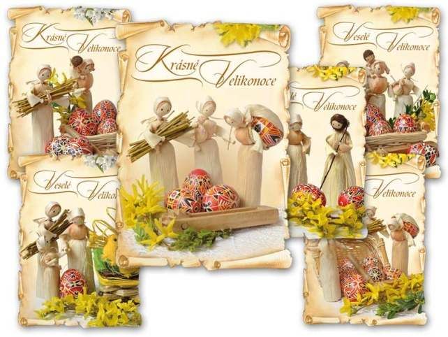 Pohlednice s velikonočním motivem. Text obsahují na zadní straně 4 pohlednice z 6. Papír: pohlednicový karton 240 g Povrchová úprava: bez laku s výsekem