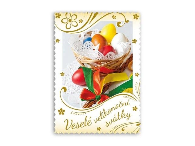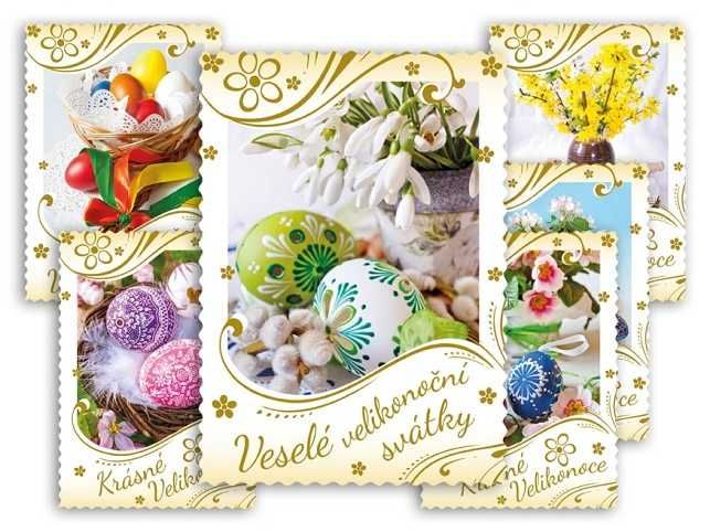 Pohlednice s velikonočním motivem. Text na zadní straně obsahují 4 pohlednice z 6. Text na přední straně: Krásné Velikonoce, Radostné Velikonoce, Veselé velikonoční svátky Text na zadní straně: Pohlednice 1: V radosti a harmonii prožité jarní svátky a hodně radosti z prvních slunečních paprsků přeje Pohlednice 2: Veselé Velikonoce a hodně radosti z prvních jarních paprsků přeje Pohlednice 3: Krásné prožití velikonočních svátků a bohatou pomlázku ze srdce přeje Pohlednice 4: Příjemné prožití velikonočních svátků a krásné jaro přeje Pohlednice 5, 6 bez textu Papír: pohlednicový karton 240 g Povrchová úprava: UV lak, výsek, glitter Text: 4/6 Uvedená cena je za 1ks.