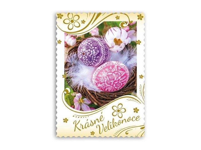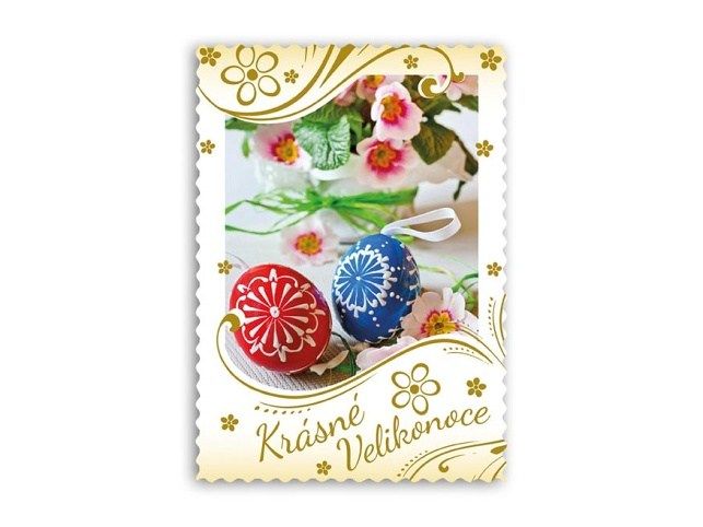 Pohlednice s velikonočním motivem. Text na zadní straně obsahují 4 pohlednice z 6. Text na přední straně: Krásné Velikonoce, Radostné Velikonoce, Veselé velikonoční svátky Text na zadní straně: Pohlednice 1: V radosti a harmonii prožité jarní svátky a hodně radosti z prvních slunečních paprsků přeje Pohlednice 2: Veselé Velikonoce a hodně radosti z prvních jarních paprsků přeje Pohlednice 3: Krásné prožití velikonočních svátků a bohatou pomlázku ze srdce přeje Pohlednice 4: Příjemné prožití velikonočních svátků a krásné jaro přeje Pohlednice 5, 6 bez textu Papír: pohlednicový karton 240 g Povrchová úprava: UV lak, výsek, glitter Text: 4/6 Uvedená cena je za 1ks.