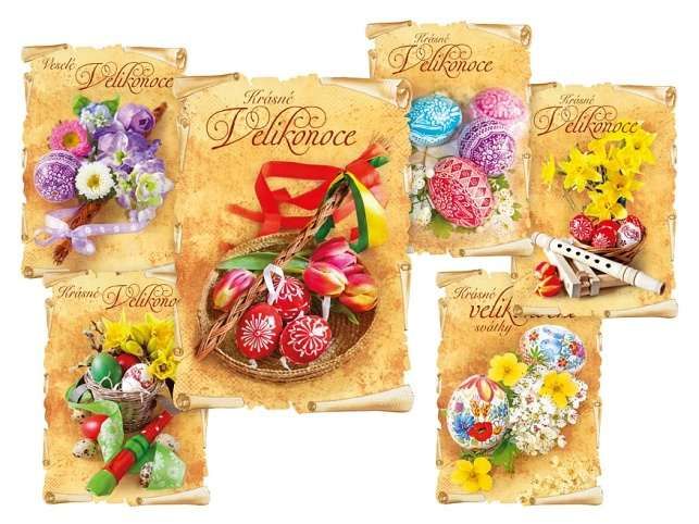 Pohlednice s velikonočním motivem. Text na zadní straně obsahují 4 pohlednice z 6. Text na přední straně: Krásné Velikonoce, Veselé Velikonoce, Krásné velikonoční svátky Text na zadní straně: Pohlednice 1: Veselé Velikonoce a hodně radosti z prvních jarních paprsků přeje Pohlednice 2: Příjemné prožití velikonočních svátků a krásné jaro přeje Pohlednice 3: Krásné prožití velikonočních svátků a bohatou pomlázku ze srdce přeje Pohlednice 4: Klidné prožití velikonočních svátků a hodně radosti z příchodu jara přeje Pohlednice 5 a 6 bez textu Papír: pohlednicový karton 240 g Povrchová úprava: výsek Text: 4/6 Uvedená cena je za 1ks.