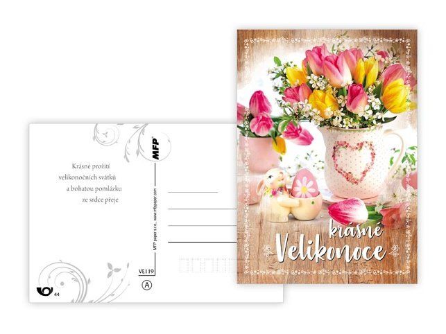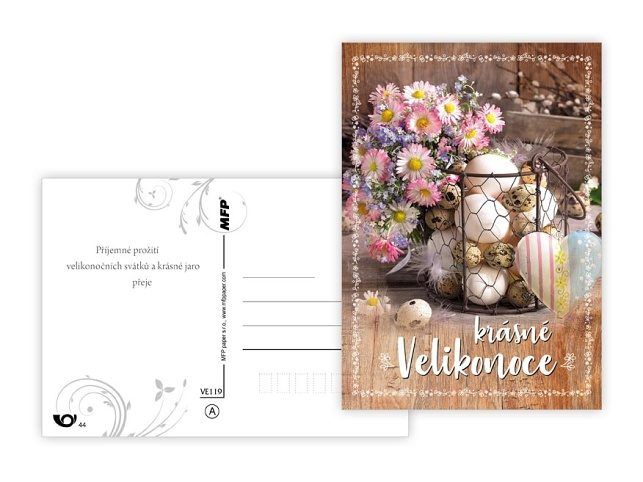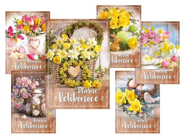 Pohlednice s velikonočním motivem. Text na zadní straně obsahují 3 pohlednice z 6. Text na přední straně: Veselé Velikonoce Text na zadní straně: Pohlednice 1: Krásné prožití velikonočních svátků a bohatou pomlázku ze srdce přeje Pohlednice 2: Příjemné prožití velikonočních svátků a krásné jaro přeje Pohlednice 3: Veselé Velikonoce a hodně radosti z prvních jarních paprsků Pohlednice 4-6 bez textu Papír: pohlednicový karton 240 g Povrchová úprava: bez povrchové úpravy Text: 3/6 Uvedená cena je za 1ks.