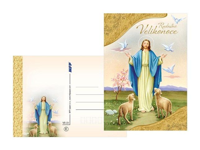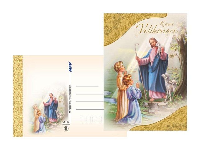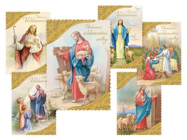 Pohlednice s velikonočním motivem. Text na přední straně: Pohlednice 1: Požehnané Velikonoce Pohlednice 2: Krásné Velikonoce Pohlednice 3: Požehnané velikonoční svátky Pohlednice 4: Radostné Velikonoce Pohlednice 5: Požehnané velikonoční svátky Pohlednice 6: Požehnané velikonoční svátky Text na zadní straně: Bez textu. Papír: pohlednicový karton 240 g Uvedená cena je za 1ks.