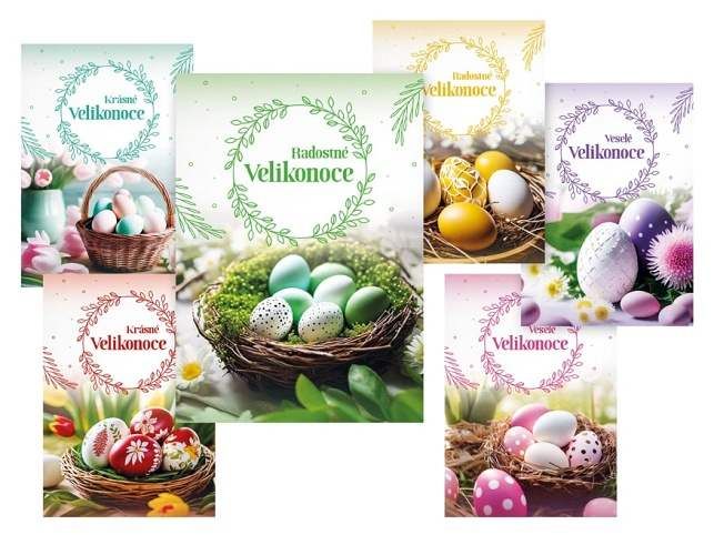 Pohlednice s velikonočním motivem kraslic. Potěšte své blízké a popřejte jim krásné jarní svátky. Text na zadní straně obsahují 3 pohlednice z 6. Text na přední straně: Krásné Velikonoce, Krásné Velikonoce, Radostné Velikonoce, Radostné Velikonoce, Veselé Velikonoce, Veselé Velikonoce Text na zadní straně: Pohlednice 1 : Příjemné prožití velikonočních svátků a krásné jaro přeje Pohlednice 2 : Veselé Velikonoce a hodně radosti z prvních jarních paprsků přeje Pohlednice 3 : Krásné prožití velikonočních svátků a bohatou pomlázku ze srdce přeje Pohlednice 4 - 6 bez textu Text: 3/6 Povrchová úprava: UV lak Papír: pohlednicový karton 240 g Uvedená cena je za 1 ks.