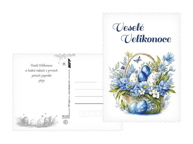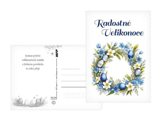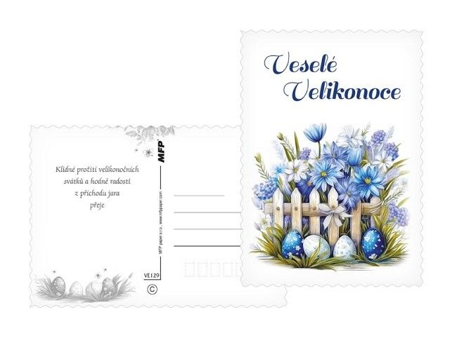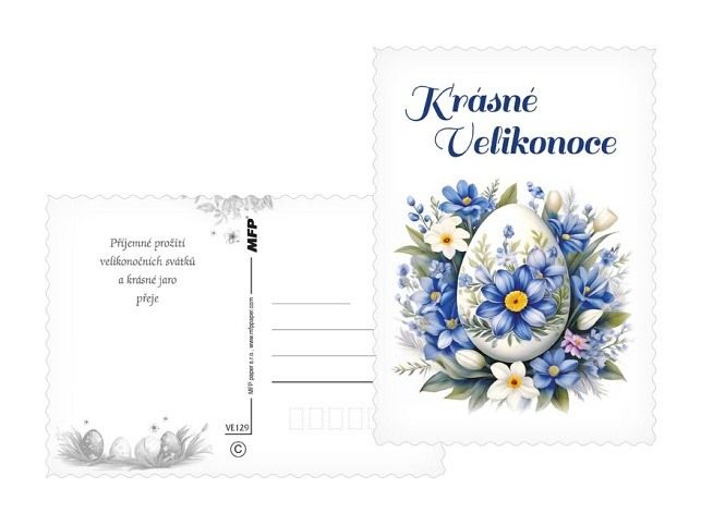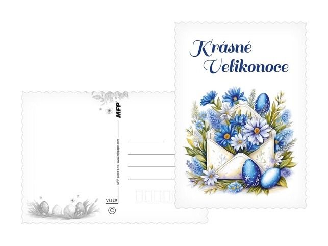 Přineste kouzlo jara přímo do schránky! Tyto nádherné velikonoční pohlednice jsou jako stvořené pro sdílení radosti, jarní energie a sváteční nálady. Každá pohlednice je jako drobný kousek jarní louky – plná jemných květin, zářivých kraslic a veselých motivů, které vám vykouzlí úsměv na tváři. Pošlete svým blízkým krásné přání, které říká: Jaro je tady a myslím na tebe! Text na přední straně: Radostné Velikonoce, Veselé Velikonoce, Krásné Velikonoce, Radostné Velikonoce, Veselé Velikonoce, Radostné Velikonoce Text na zadní straně: Pohlednice 1: Veselé Velikonoce a hodně radosti z prvních jarních paprsků přeje Pohlednice 2: Krásné prožití velikonočních svátků a bohatou pomlázku ze srdce přeje Pohlednice 3: Příjemné prožití velikonočních svátků a krásné jaro přeje Pohlednice 4: Klidné prožití velikonočních svátků a hodně radosti z příchodu jara přeje Pohlednice 5-6 bez textu Text: 4/6 Povrchová úprava: výsek Papír: pohlednicový karton 240 g Uvedená cena je za 1 ks.
