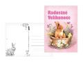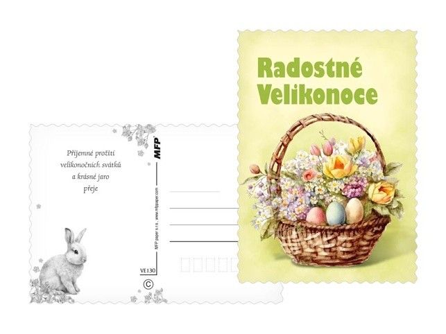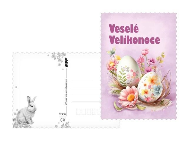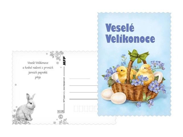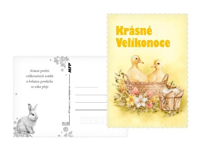 Velikonoční pohlednice plné jarního kouzla a radosti! Vneste do Velikonoc špetku tradice a jemné krásy! Tyto pohlednice zachycují ty nejmilejší symboly jara – roztomilého zajíčka, veselá kuřátka, barevné kraslice a voňavé květiny. Ať už chcete potěšit rodinu, přátele nebo kolegy, tyto pohlednice jsou skvělým způsobem, jak sdílet radost a přání krásných svátků. Text na přední straně: Krásné Velikonoce, Veselé Velikonoce, Radostné velikonoce, Krásné Velikonoce, veselé Velikonoce, Radostné Velikonoce Text na zadní straně: Pohlednice 1: Veselé Velikonoce a hodně radosti z prvních jarních paprsků přeje Pohlednice 2: Krásné prožití velikonočních svátků a bohatou pomlázku ze srdce přeje Pohlednice 3: Příjemné prožití velikonočních svátků a krásné jaro přeje Pohlednice 4-6 bez textu Text: 3/6 Povrchová úprava: výsek Papír: pohlednicový karton 240 g Uvedená cena je za 1 ks.