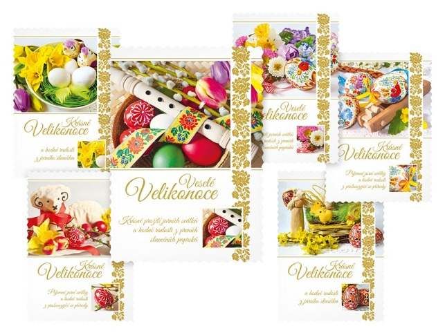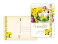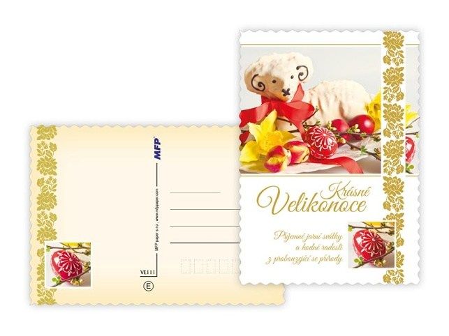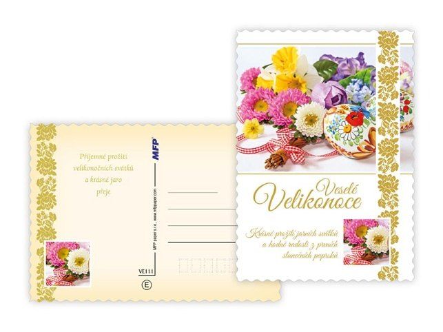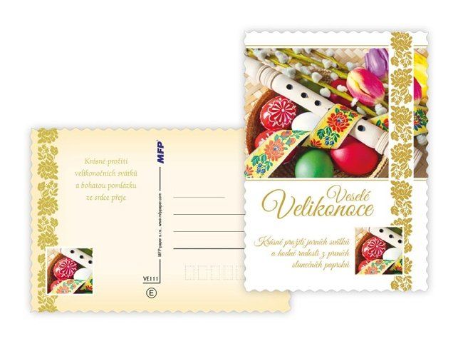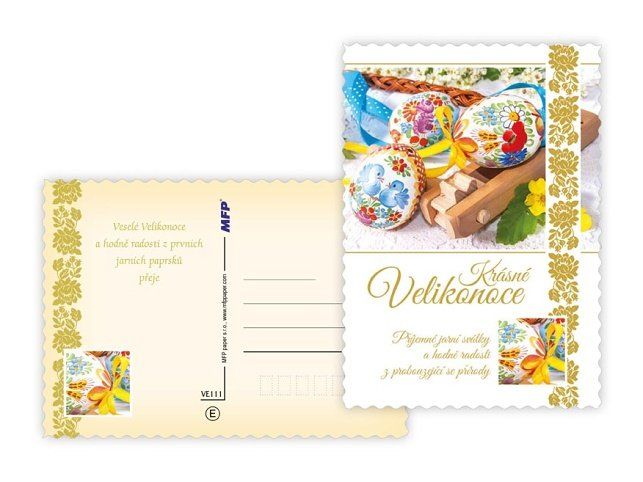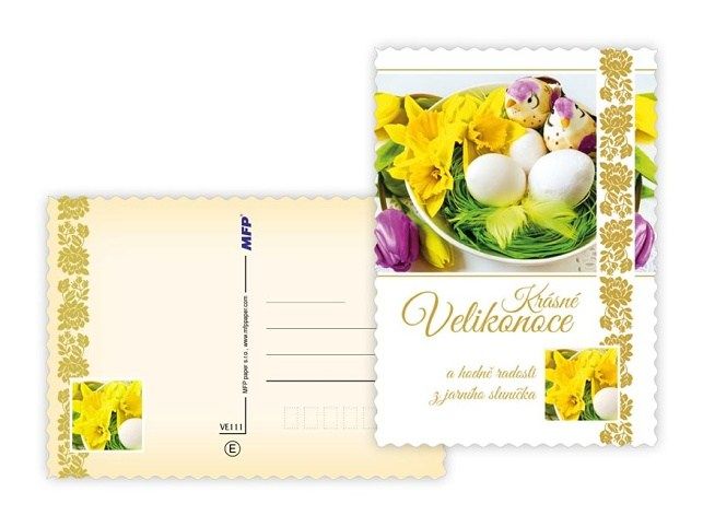 Pohlednice s velikonočním motivem. Text na zadní straně obsahuje 4 pohlednice z 6. Papír: pohlednicový karton 240 g Povrchová úprava: glitr + výsek + UV lak Text: 4/6 Uvedená cena je za 1ks.