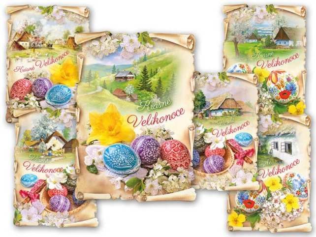 Pohlednice s velikonočním motivem. Text obsahuje na zadní straně 6 pohlednic z 6. Text na přední straně: Krásné Velikonoce, Veselé Velikonoce Text na zadní straně: Pohlednice 1: Krásné prožití velikonočních svátků a bohatou pomlázku ze srdce přeje Pohlednice 2: Klidné prožití velikonočních svátků a hodně radosti z příchodu jara přeje Pohlednice 3: V radosti a harmonii prožité jarní svátky a hodně radosti z prvních slunečních paprsků ze srdce přeje Pohlednice 4: Krásné prožití velikonočních svátků a hodně radosti z prvních jarních paprsků a probouzející se přírody ze srdce přeje Pohlednice 5: Příjemné prožití velikonočních svátků a krásné jaro přeje Pohlednice 6: Veselé Velikonoce a hodně radosti z prvních jarních paprsků přeje Papír: pohlednicový karton 240 g Povrchová úprava: bez laku s výsekem Text: 6/6 Uvedená cena je za 1ks.