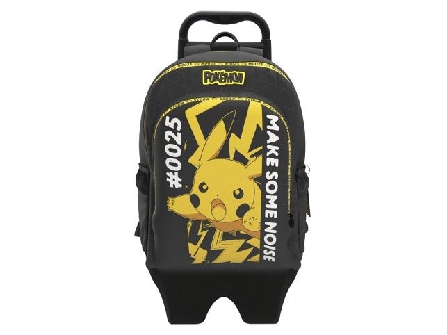 Pokémon školní batoh Twilight Champions Pikachu je designovaný s výrazným motivem oblíbené postavičky Pikachu z populární série Pokémon. Batoh je převážně černý s kontrastními žlutými detaily, které zdůrazňují motiv blesků a číslo #0025, což je oficiální číslo Pikachua v herním a animovaném světě Pokémonů. Na přední straně batohu je velký potisk Pikachua v akční póze spolu s nápisem „Make Some Noise“, který dodává batohu dynamický a energický vzhled. Batoh je vybaven jedním hlavním prostorným oddílem a menším předním kapsou, obě uzavíratelné na zip, jejichž táhla jsou doplněna žlutými stuhami s nápisem a číslem #0025, což zvyšuje estetickou atraktivitu a zároveň usnadňuje manipulaci se zipy. Po bocích batohu se nachází síťované kapsy, vhodné například na láhev s pitím nebo drobné předměty, které je potřeba mít rychle po ruce. Zadní strana batohu je polstrovaná pro pohodlné nošení, stejně jako ramenní popruhy, které jsou nastavitelné a ergonomicky tvarované, což zajišťuje lepší rozložení váhy a komfort při nošení i delší dobu. Batoh disponuje také horním uchem pro přenášení v ruce. Díky kompaktním rozměrům a pevné konstrukci je batoh vhodný nejen pro školní potřeby, ale i pro volnočasové aktivity. Celkově tento školní batoh kombinuje praktické využití s výrazným licencovaným motivem, který ocení fanoušci Pokémonů všech věkových kategorií. Jeho moderní design, kvalitní materiály a propracované detaily jej řadí mezi oblíbené doplňky pro fanoušky této značky.
