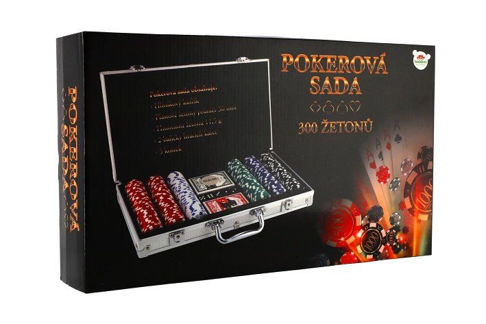Poker sada 300ks + karty + kostky v hliníkovém kufříku v krabici 40x24x8cm