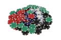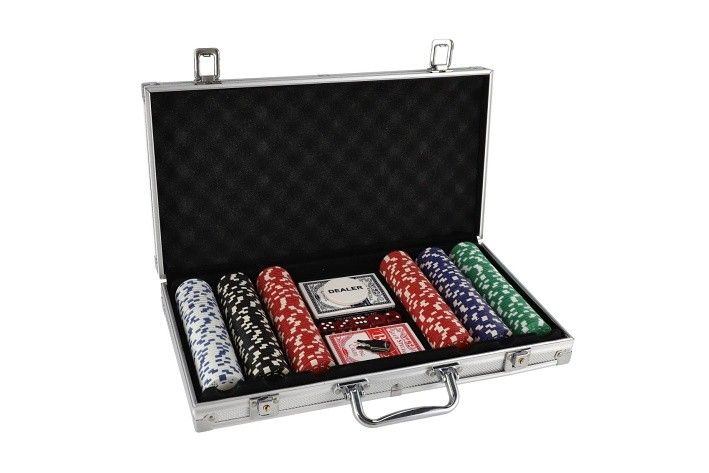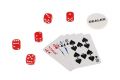 Sada obsahuje: žetony (300 ks, průměr 30mm, hmotnost 11,5g), 2 balíčky karet, 5 kostek