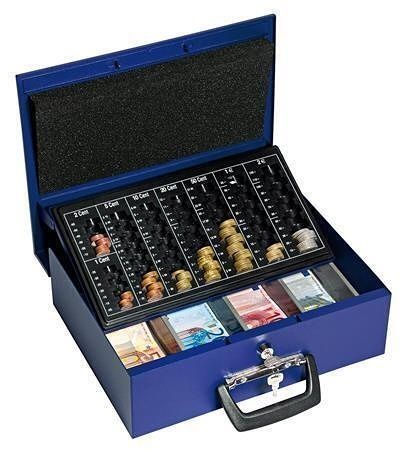 Vlastnosti: pevná rukojeť; čtyřdílná vložka na bankovky; přihrádka na mince; bezpečnostní zámek a 2 klíče;
