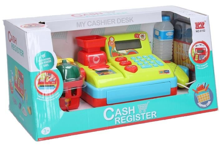 Pokladna s efekty 23cm. Pokladna funguje jako kalkulačka. Obsahuje pokladnu s váhou, vyjížděcí papírovou účtenkou, vysunovacím šuplíkem, peníze a košík s nákupem. Světelné a zvukové efekty. Při použití karty se pokladna vynuluje. Baterie 2xAA součástí.