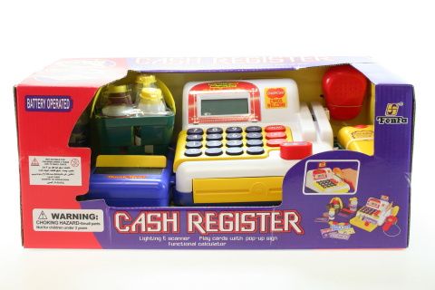 Pokladna s příslušenstvím. Napájení na 2x AA baterie. Pokladna má vysunovací šuplík na peníze, čtečku karet, snímač čárových kódů a pohyblivý pás. Pokladna vydává zvuky, svítí a umí počítat. Součástí je také nákupní košík se zbožím a peníze. Rozměry cca 27 x 19 cm. Věk 3+
