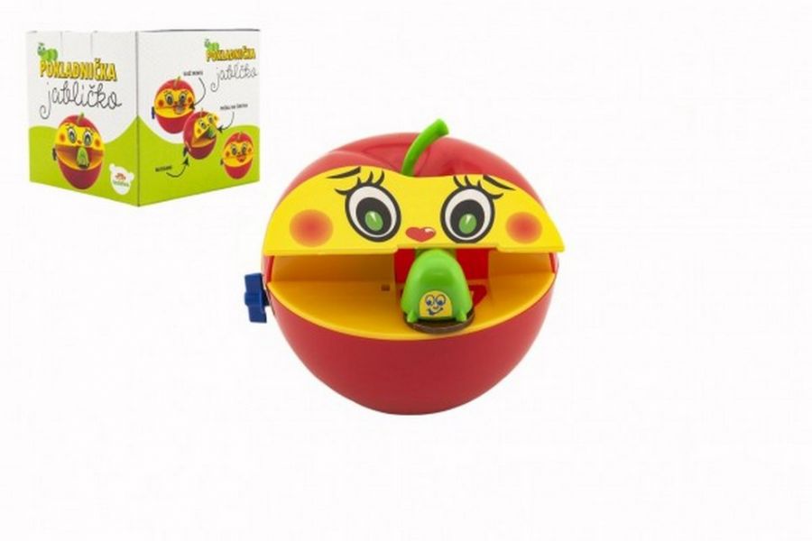 Plastová pokladnička jablko má mechanické natahování na klíček. Po vložení mince si červík minci vezme a ukryje ji v jablku. Mince lze vyndat po odklopení víčka na dně pokladničky. Rozměry balení 11 x 11 x 10 cm. Vhodné pro děti od 3 let.