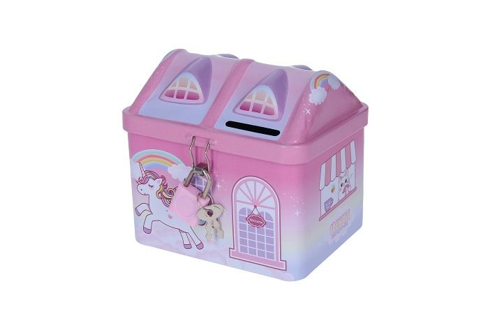 Pokladnička jednorožec v růžové barvě.