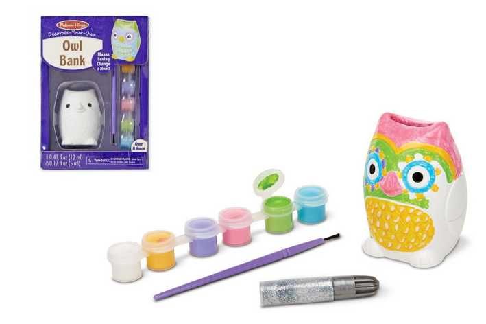 Obsahuje: bílou kasičku ve tvaru sovy, třpytivé lepidlo, 6 kelímků barvy a snadno čistitelný štětec.