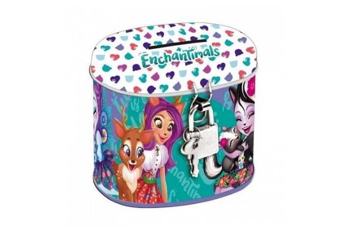 Oválná, lakovaná, kovová pokladnička s víkem uzamykatelným na zámek s 2 klíčky. Perfektní dárek, který naučí děti šetřit a peníze jsou tak v bezpečí. Pokladnička je zdobena pohádkovými postavičkami.
