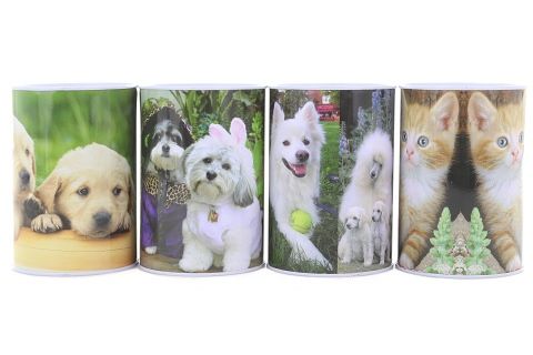 Plechová pokladnička s motivem pejsků a kočiček o velikosti cca 12 x 8,5 cm. Baleno v sáčku. Pokladnička nemá otvírání. Věk 3+