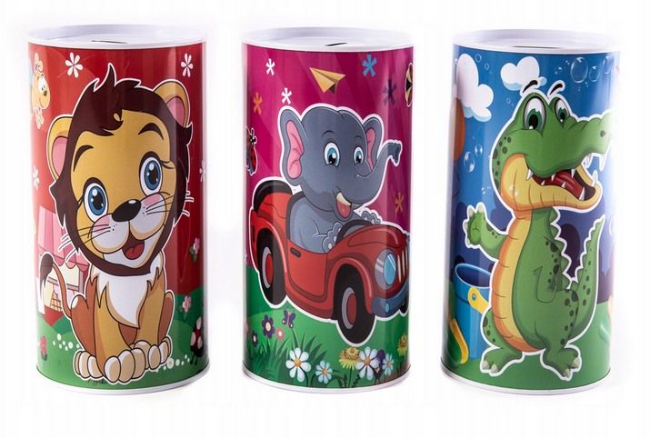 Barevná plechová pokladnička s veselými motivy. Ideální dárek pro malé i velké spořivce. Neotvíratelná – pro vyjmutí úspor je nutné víčko rozlomit.