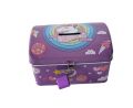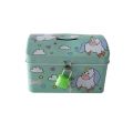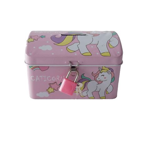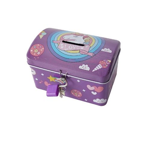 Kovová pokladnička na zámek. Do pokladničky děti ukládají svoje úspory a učí se šetřit penízky.