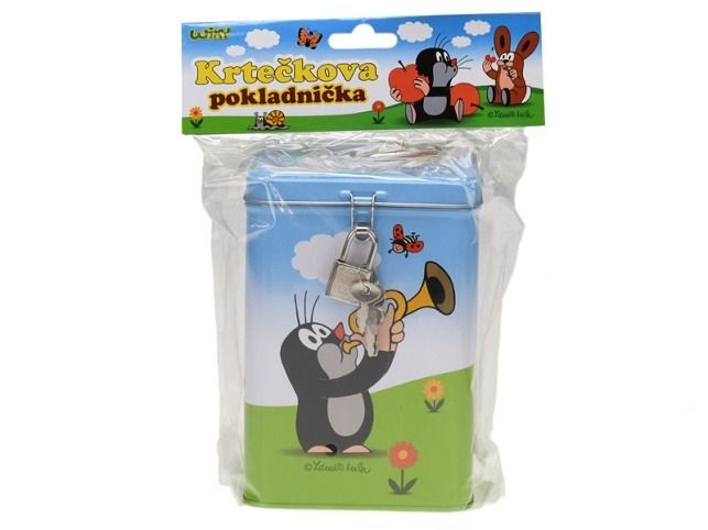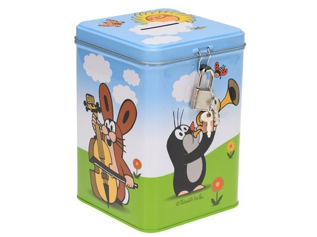 Kovová pokladnička s motivem Krtečka o velikosti 15cm je vybavena zámkem pro její bezpečnost.