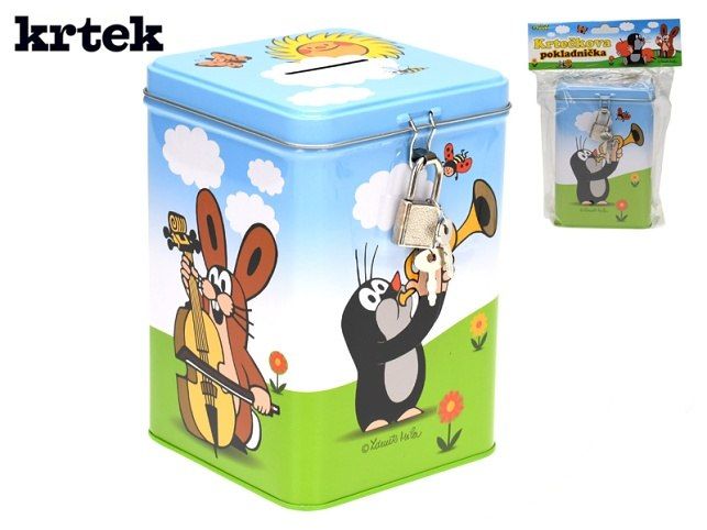 Kovová pokladnička s motivem Krtečka o velikosti 15cm je vybavena zámkem pro její bezpečnost.
