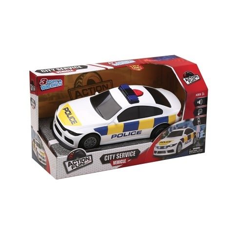 Policejní auto na setrvačník, se třemi zvukovými a světelnými efekty. Auto vyžaduje 2AA baterie, nejsou součástí balení. Pro děti od 3 let. Na baterie: 2x AA (jsou součástí balení)