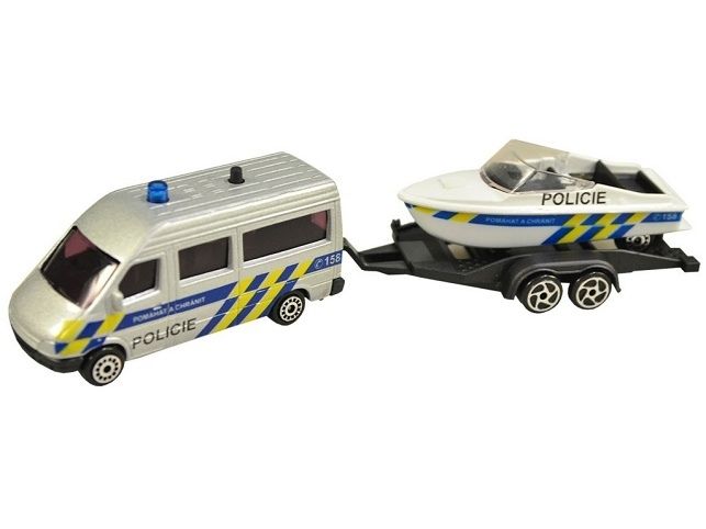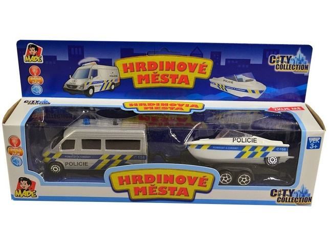 Policejní auto s přívěsem a lodí, světlo a zvuk, volná kola, 19cm. Z české kolekce City collection. Volná kola. Rozměr hračky je 19cm.