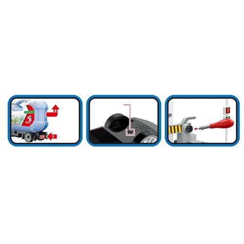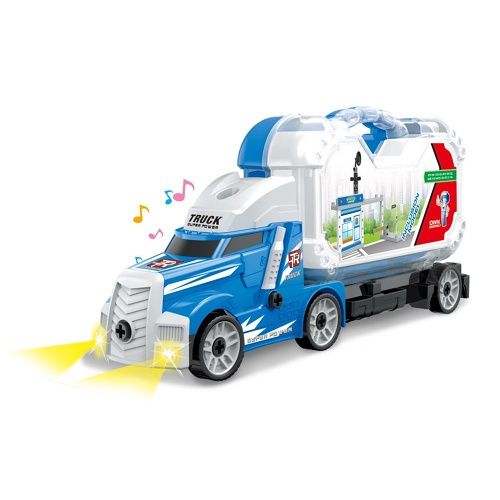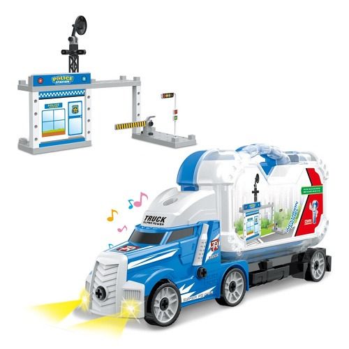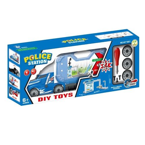 Policie potřebuje tvou pomoc! Poskládej si policejní základnu, vyjmi kufr z náklaďáku a použij součástky na opravu kol! Sada obsahuje jedno velké auto s kufrem na opravu, malé pomocné vozidlo a součástky na složení policejní základny. Auto vydává realistické zvuky a bliká. 3 ks baterií typu AG13 jsou součástí balení. S tímto autem mohou děti rozvíjet svoji zručnost!