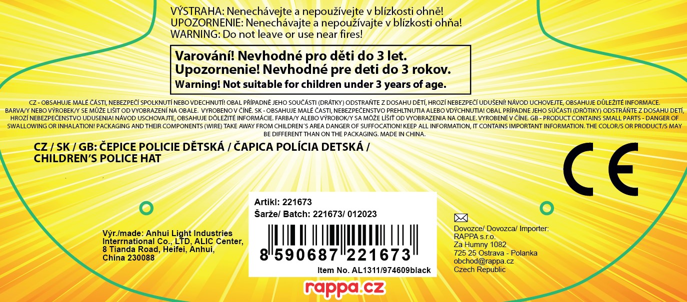 Čepice se kterou vyladíte svůj policejní kostým k dokonalosti! Stylová policejní čepice pro všechny malé policisty je zdobena v přední části potiskem odznaku a nápisem.