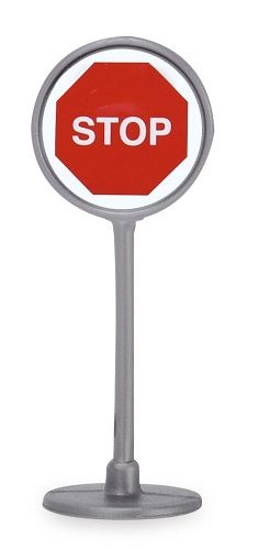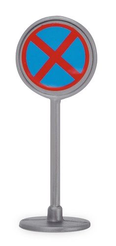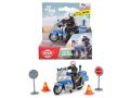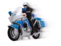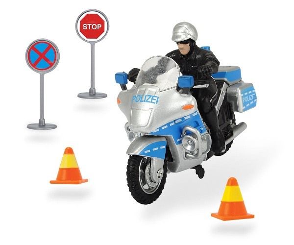 Policejní motocykl s řidičem na setrvačník. Součástí 2 dopravní značky a 2 dopravní kužely. Délka 10 cm.