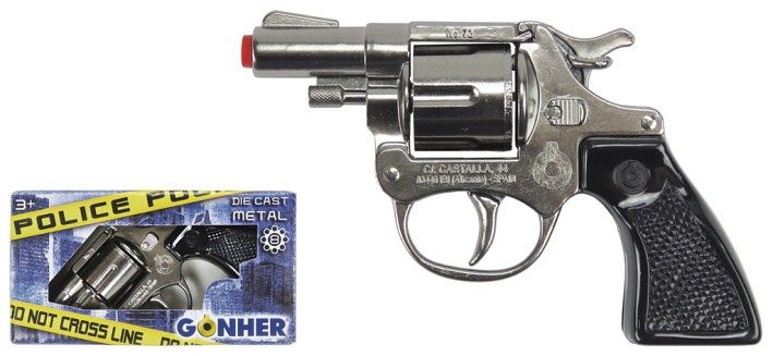 Policejní revolver kovový, stříbrný – na kapslíky osm ran.Velikost