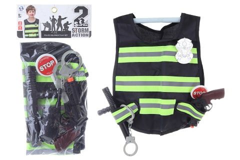 Sada pro malého policistu. Balení obsahuje vestu, odznak, obušek, pistoli na baterie, plácačku, vysílačku a pouta. Napájení na 3 AG13 baterie (jsou součástí). Rozměry vesty cca 34 x 41 cm. Rozměry balení cca 19 x 39 x 3 cm. Věk 6+