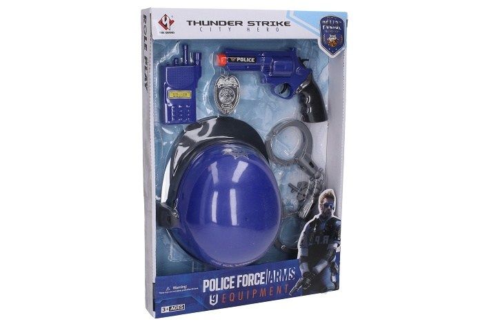 Policejní sada s přilbou 26 x 22 cm. Obsah balení - pistole 20 cm (akustické zvukové efekty), policejní odznak, vysílačka, pouta s klíčem, přilba 26x22 cm.