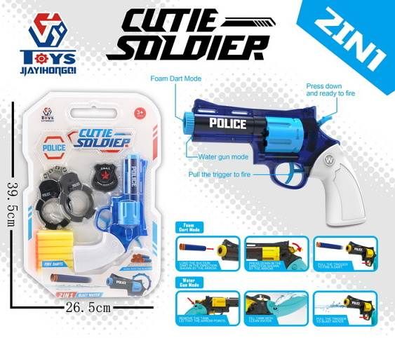 Policejní set. Pistole střílí pěnové náboje i vodu. Součástí pistole, pěnové náboje, odznak, pouta. 2 varianty - modrá, žlutá.